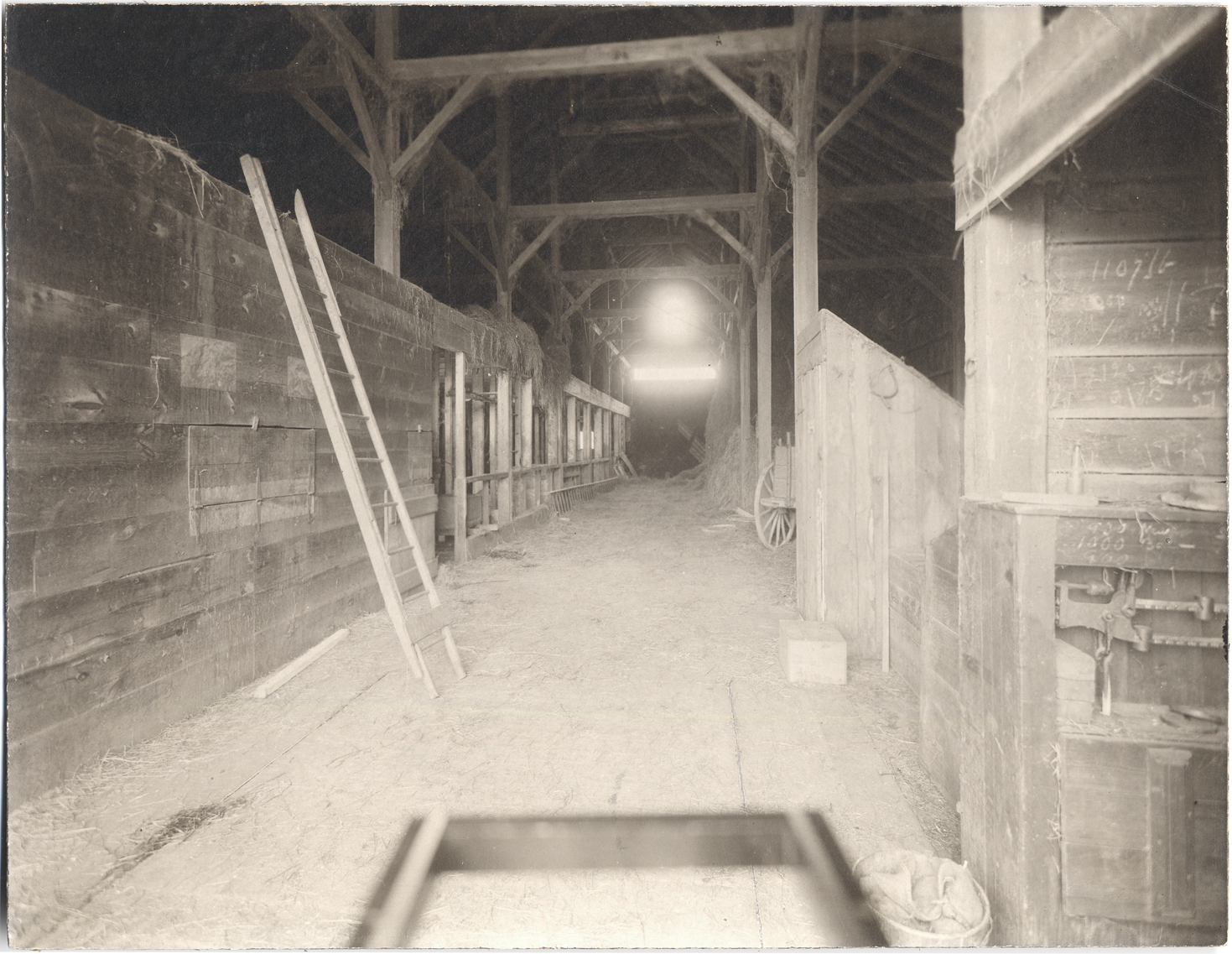 Interior view of stable; wooden stalls and rafters; ladder leans against a stall; basket and scale in foreground. Handwritten on back: "Int ... stable." Stamped on back: "J.E. Purdy & Co., high grade photographers, 146 Tremont St., Boston."