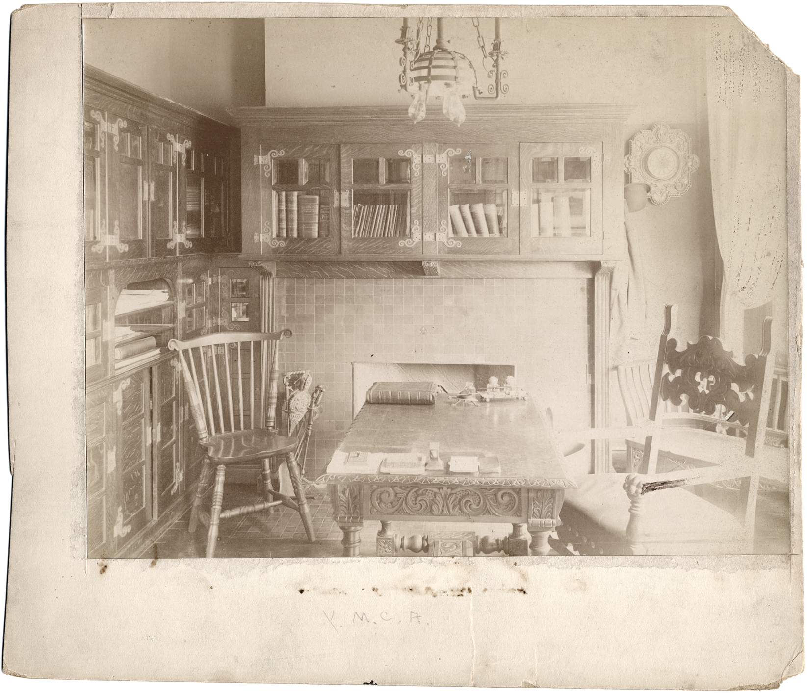 Table with writing implements and book; two wooden chairs. Glass-fronted bookcases, including one built over tiled fireplace. Stamped on mat back: "1127." Handwritten on mat back: "Library Y.M.C.A. bldg. 314. 57."