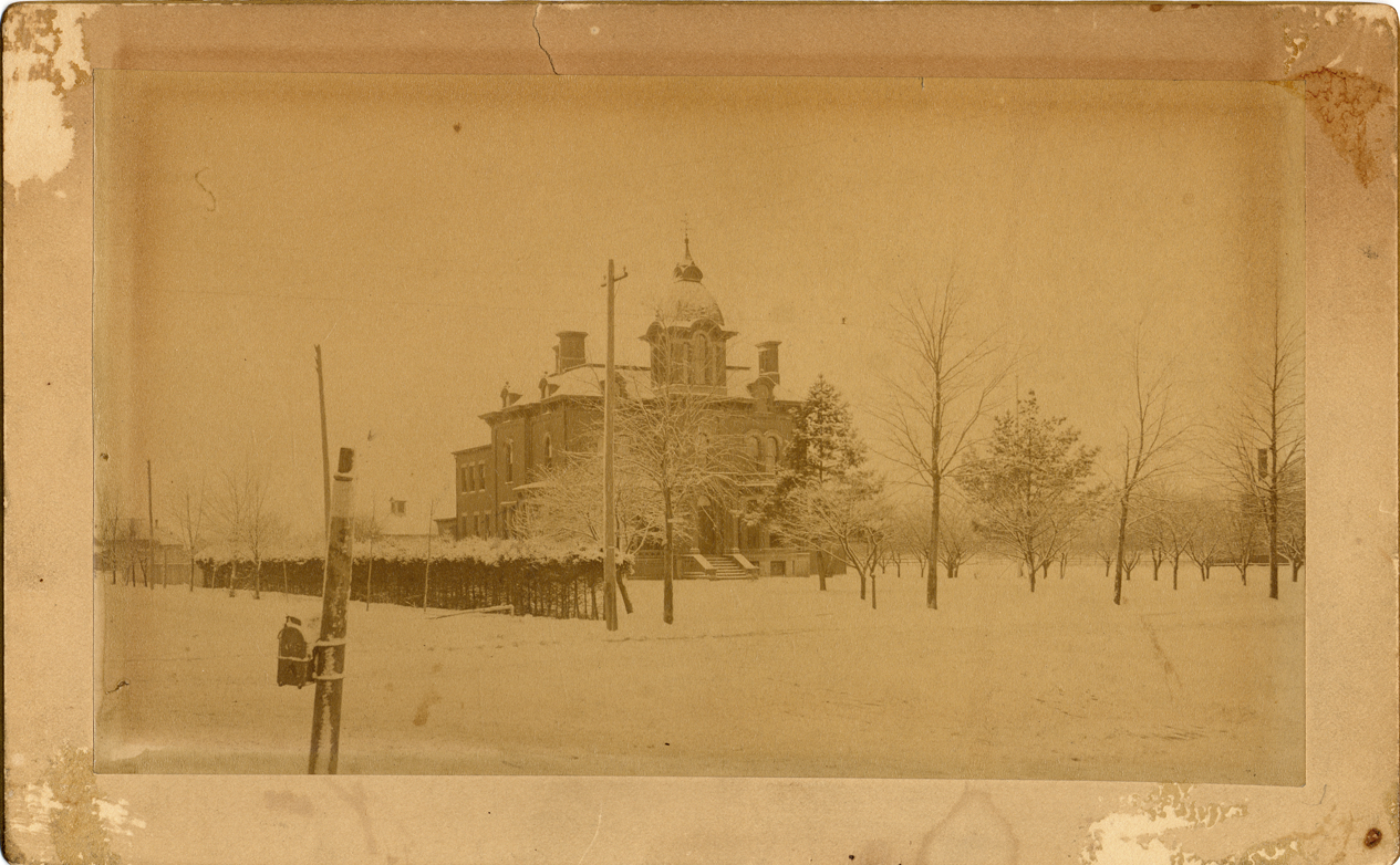 View of Robert Oakman residence in winter; Italianate architecture; cupola. Label on back: "Year 1872. Mr. Joseph Moross, Mrs. Robert Oakman father built this house in 1872. My father was a building contractor, the finest in Detroit."