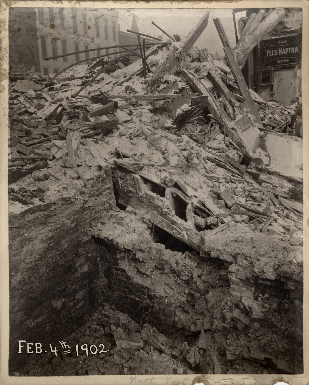 Pile of rubble from fire that destroyed Crusoe Brothers wholesale grocery building. Sign visible reads: "Get Fels Naptha here." Other buildings beyond; one has sign reading "Bakers & confectioners." Written on photograph front: "Feb. 4th 1902." Handwritten on mat front: "North east." Handwritten on mat back: "15." Damage on mat bottom.