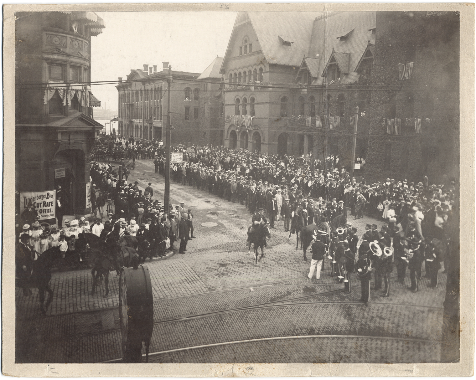 Men on horseback; brass band; group of men wearing straw boaters stands in formation; buildings decorated with flags. Handwritten on back: "Reception to Alger, Detroit, Aug. 2, 1899. Escort and band playing 'Home, Sweet Home' at the railroad station."
