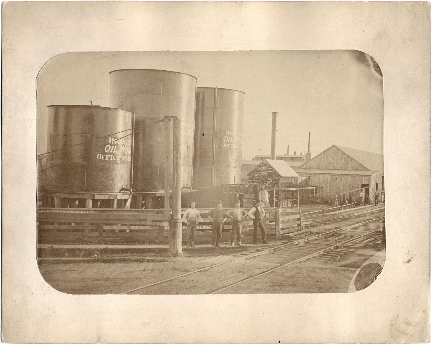 View of four men standing in front of wooden fence, three oil tanks and other factory buildings; railroad tracks in foreground. Painted on side of tanks: "Ingalls Oil Works." Handwritten on back: "Oil tanks on Michigan Ave. near Junction about 1881. Ingalls & Co. illuminating and lubricating oil tank, 46 Jefferson, 1883."