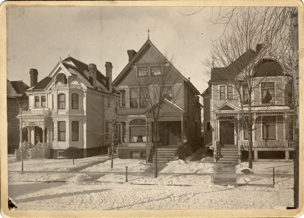 Three clapboard houses on snowy street, sidewalks cleared. Handwitten on card back: "House Frances E. Rankin, n.s. Hendrie bet John R. & Brush, end house (which end?)."