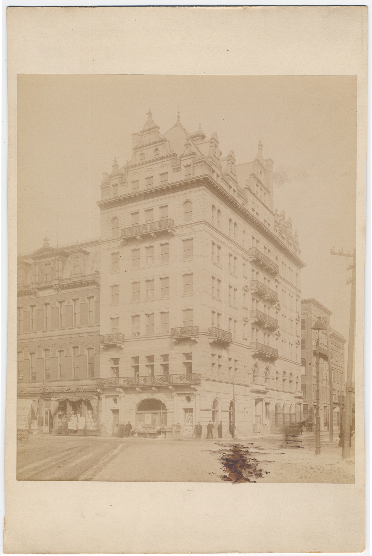 View of St. Claire Hotel from corner; some ornate balconies; several men wearing hats stand in front of building; sidewalk vendor. Handwritten on back: "The St. Claire Hotel, a better view of this occupied will be available within 30 days." Stamped on back: "From Alvord & Co., exclusively commercial photographers, 55 Rowland St., Detroit, Mich., ground floor."
