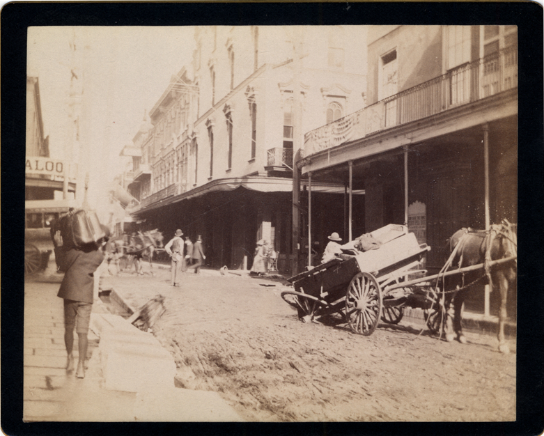 Street scene; horse and wagon with broken wheel; man walks down street carrying suitcase; balconies over storefronts.