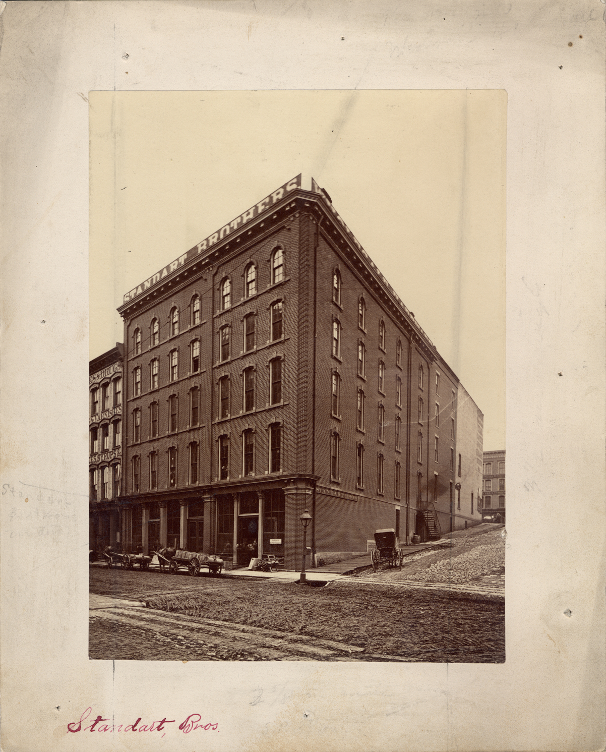 Brick building viewed at an angle across unpaved intersection. Several men standing in doorway. Horse-drawn wagons in front of store, horse-drawn carriage on side; side street up-hill. Handwritten on mat front: "Standart Bros." Handwritten on mat back: "N.W. cor. Woodbridge & Wayne Sts. 1881. Standart Bros. wholesale hardware, 92-96 Woodbridge W. 1883."