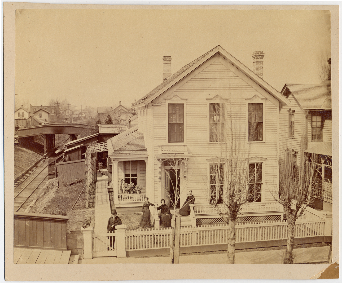 Two-story clapboard house with tall windows, small side and entry porch. Man and three women posing around front yard. Sign on house reads "Larned St." Railroad tracks on left side of photo, with bridge extending over them. Handwritten on back: "House at 455 E. Larned Street. Built by J.W. Marquis between 1863 and 1869 for a family home. In the 80s (1883?) the house was remodelled for 2 families, the second story being extended at back. Torn down when the 3rd R.R. track was laid for Grand Trunk R.R. this picture taken before 1880. People in picture, left to right: James Winchester Marquis, his dau. Annie A. Marquis, his wife Ellen nee Clark, his dau. Euphenia H. Marquis. The Marquis family lived in this house until 1904."