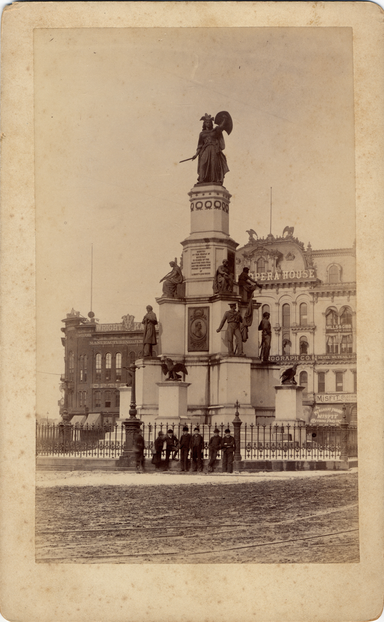 Seven boys posed in front of metal fence that surrounds monument, with some snow on the ground. Detroit Opera House, Wright & Kay, and Misfit Merchant Tailors, plus several office signs, visible behind. Stamped on card back: "From Alvord & Co., exclusive commercial photographers, 55 Rowland St., Detroit, Mich. Ground floor gallery." Handwritten on card back: "21."