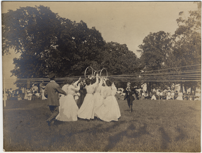 Group of women in long dresses playing a game that involves moving hoops over suspended lines of string or rope; two men approach group; spectators watch from sidelines. Handwritten on back: "Parke Davis & Co. annual picnic."