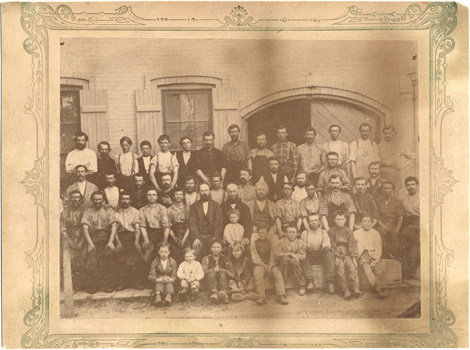 Group of men and boys wearing work clothes pose outside of brick building. Handwritten on back: "Carriage and wagon makers, 55 Gratiot. Donor's father is second from right in top row. [Gift] Henry J. Landschneider."