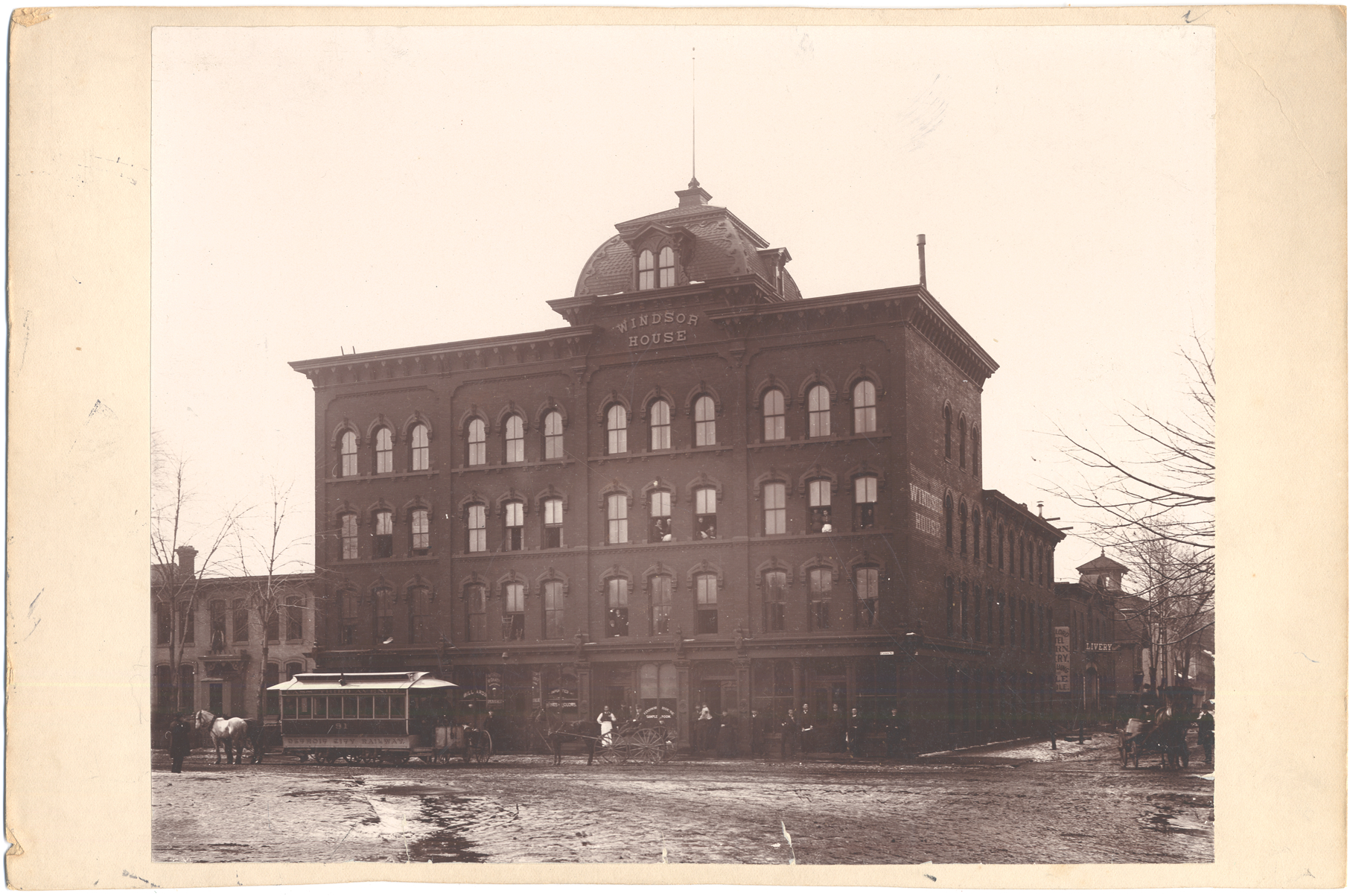 View of Windsor House; Italianate architecture; cupola; horse-drawn Detroit City Railway car; horse and cart; several men, one wearing an apron. Sign on building behind hotel: "Livery." Handwritten on back: "SW corner, Cass and Lewis (now Bagley), 205-211 Cass Avenue (after 1920-21, 1537 Cass). Built in 1866 by William Eisenlord and called the Eisenlord House. Listed in the Detroit City Directory from 1886-1895 as the Cass Avenue Hotel. Called the Morgan Hotel from 1904-1928/29."