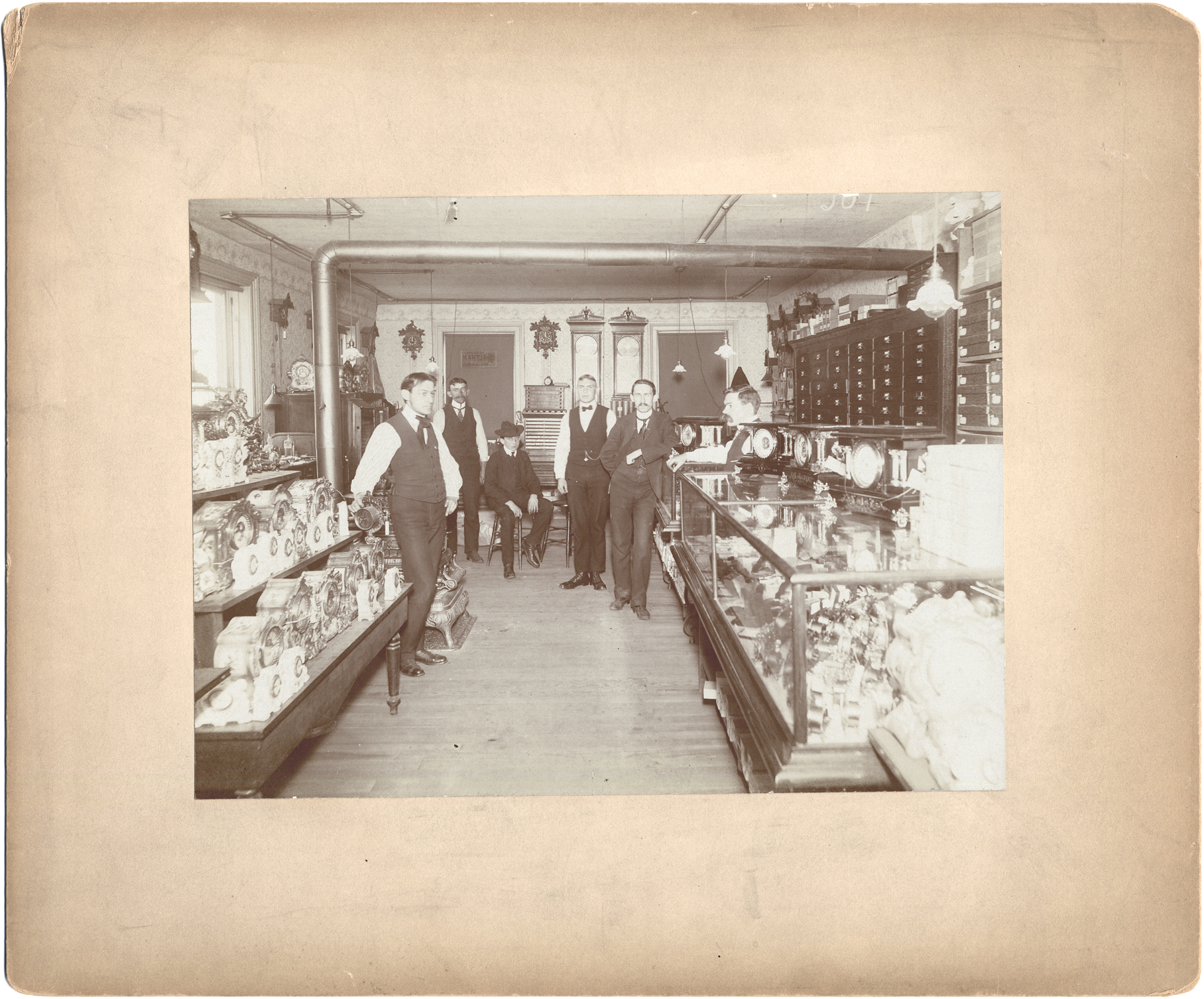 Interior of Kunz and Rogers Wholesale Jewelry store, clocks line display shelves and display case. Group of employees pose inside. Hans Carl Jensen (11/5/1881-1/24/1910) is fourth from left.