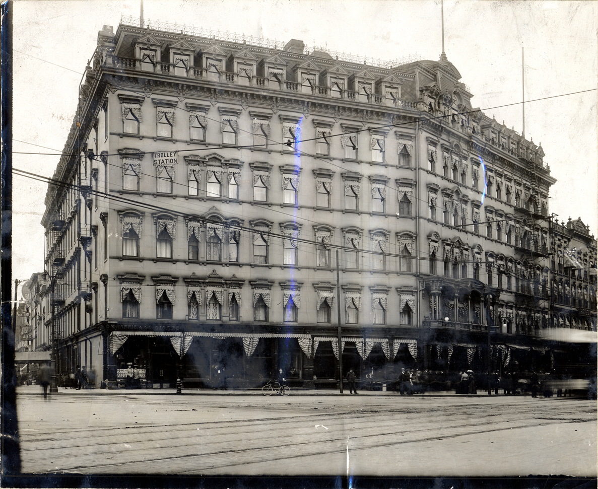 View of Russell House; man with bicycle in front of building; sign suspended from wires: "Trolley Station." Handwritten on back: "Old Russell House."