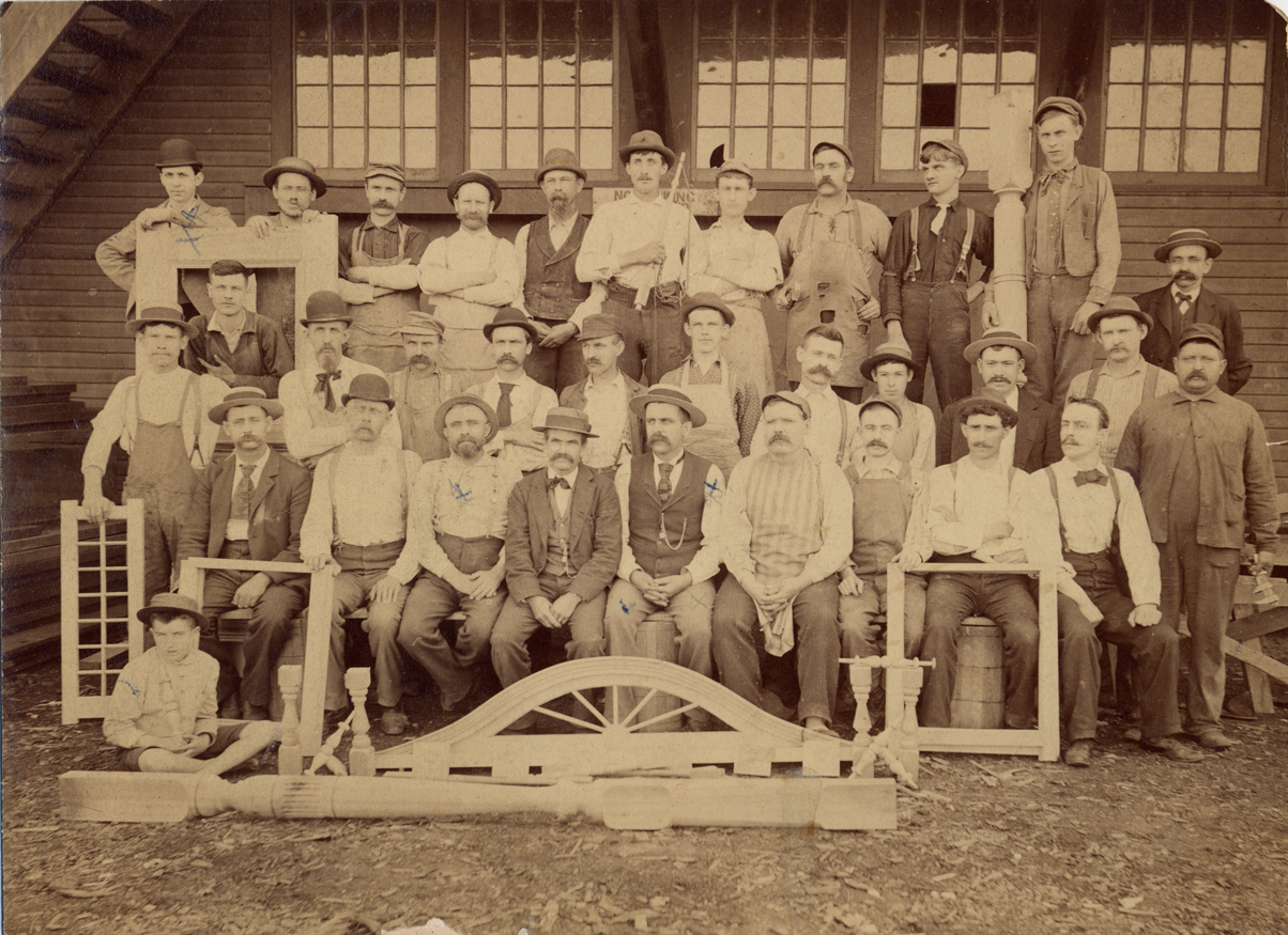 Group of workmen pose outside a wooden-frame building; some men hold window frames. Porch support and window frame in foreground. Handwritten on back: "c.1908; building still stands at 3550 Scotten. Now (1958), occupied by Wolverine Porcelain Enameling Co.; left to right, bottom row, fifth man with x on left sleeve is William Munroe, father of Ray W. Munroe. Third man from left is brother of Mrs. Henry Ford."