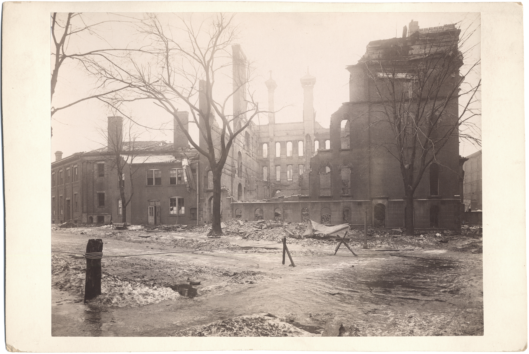Ruins of Capitol High School, after it was destroyed by fire in 1893. Side view of building, wall collapsed to show inside of building. Most of lower outer structure still standing, all internal structures gone. Stamped on back: "From Alvord & Co., exclusively commercial photographers, 55 Rowland St., Detroit, Mich., ground floor."
