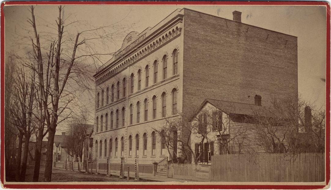 Three-story brick building, "German-American Seminary, 1850" carved in front. School for educating teachers (normal school). Surrounded by residential neighborhood. Label on back: "German American Seminary, Champlain Street between Rivard and Russell, in 1882." Handwritten on back: "See: Farmer, Silas, History of Detroit, 1:718-9."