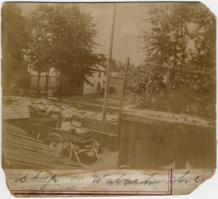 Herd of sheep on Wabash Avenue; wagon and wooden-frame buildings in foreground. Handwritten on front: "Sheep on Wabash Ave." Handwritten on back: "Wabash & Michigan Ave."