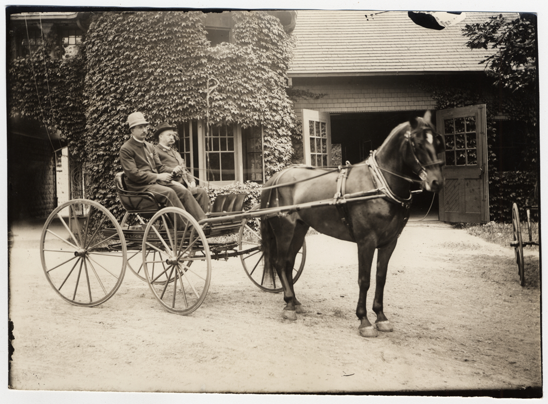 Two police officers, one in uniform, in horse-drawn carriage; "Police Department" painted on side of carriage. Handwritten on back: "The only police patrol on Belle Isle in 1896."