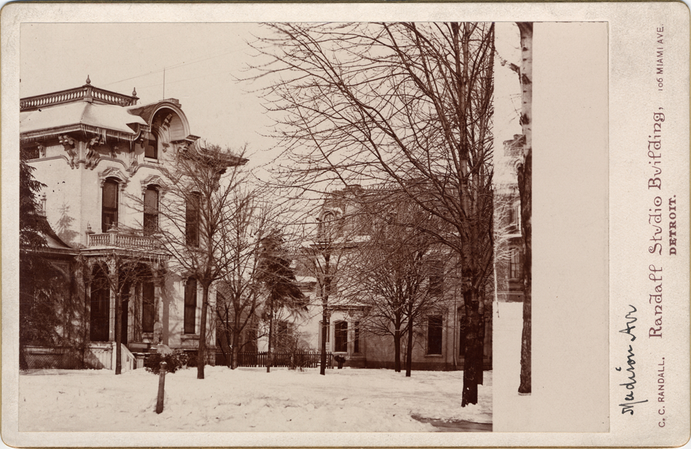 Houses on Madison Avenue, near Grand Circus Park. Large two-story brick house in foreground; snow covers ground. Printed on front: "C.C. Randall, Randall Studio Building, 106 Miami Ave., Detroit." Handwritten on front: "Madison Ave."