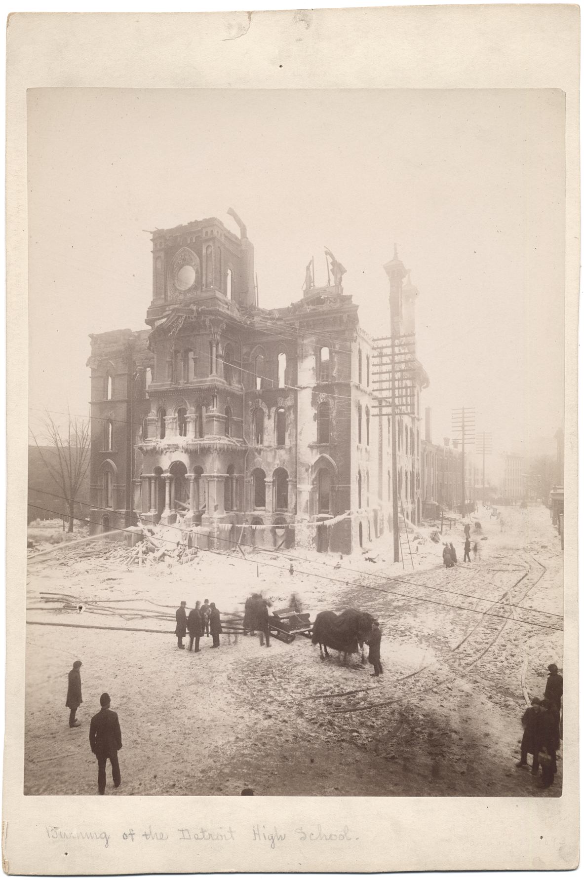 Ruins of Capitol High School, after it was destroyed by fire in 1893. Outer structure still standing, inner portions of building completely gone. Snow on ground, onlookers gathered around. Label on back: "Ruins of the Detroit High School, on site of Capitol Park, which was burned January 27, 1893." Handwritten on front: "Burning of the Detroit High School." Stamped on back: "From Alvord & Co., exclusively commercial photographers, 55 Rowland St., Detroit, Mich., ground floor."