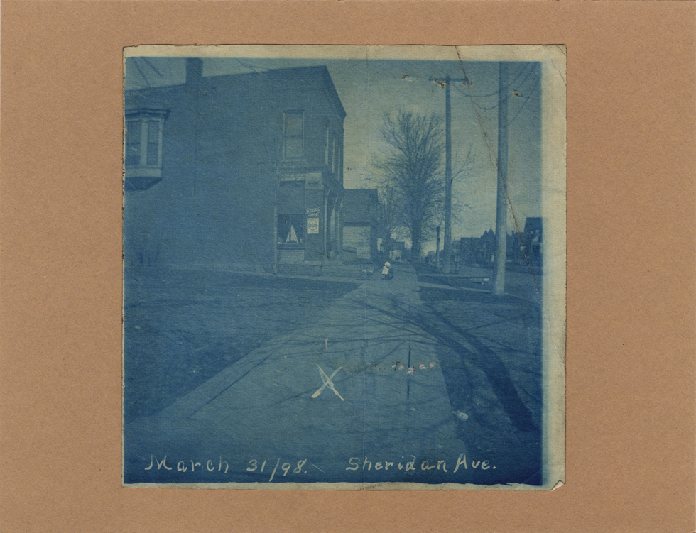 Sidewalk on Sheridan Avenue. Houses line either side of street, building advertising "Model Laundry" on left side of photo. Small child standing on sidewalk in background. Handwritten on front: "March 31 '98, Sheridan Ave."