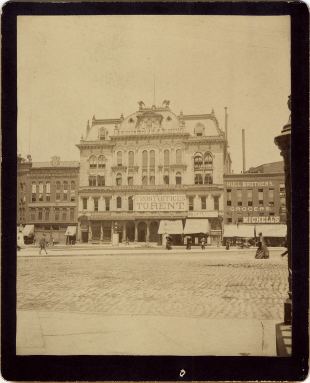 View across Cadillac Square of Detroit Opera House block. Signs include Michigan Phonograph Co.; Hull Brothers grocers; Michell's grocers; Wright & Kay; "front offices to rent." Handwritten on card back: "Cadillac Square, 1890s."