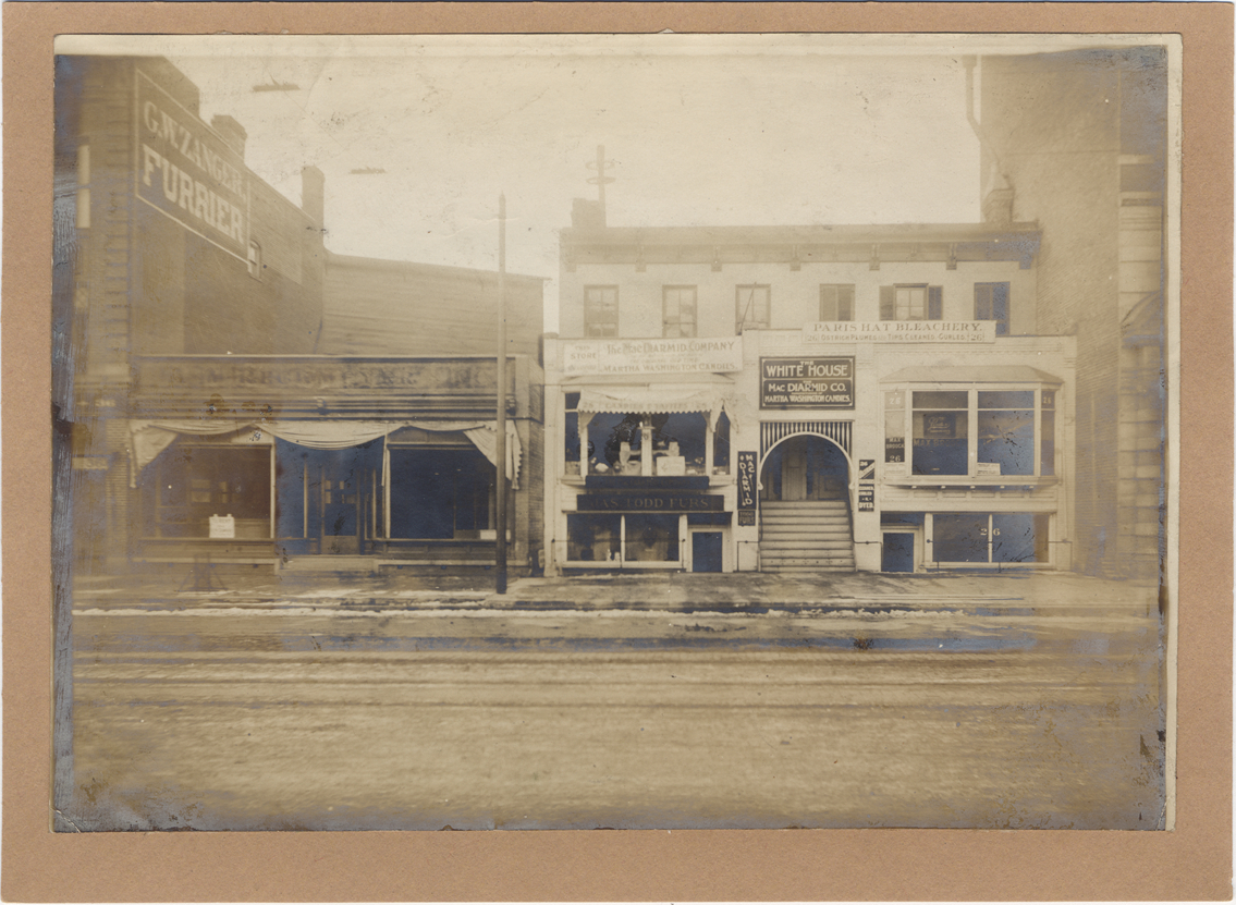 Commercial buildings on Miami Avenue include a candy company, "The White House," and hat bleachery, next to the Breitmayer business. Handwritten on back: "East side Miami, 2nd north of Gratiot next to Breitmayer, the D lot."