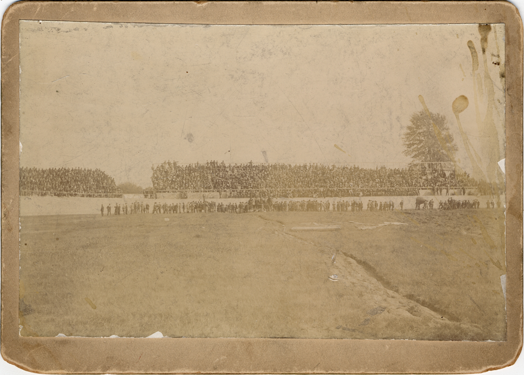 Crowd of people sitting in grandstand or bleachers, perhaps at a race track; crowd of people at the foot of grandstand; one man hold a giant megaphone. Handwritten on back: "JWB." and "G.T. Thorne, Detroit."