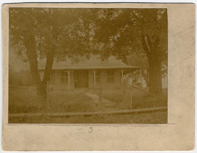 View of wooden-frame house with covered porch; fence in front. Handwritten on back: "Reaume Homestead, Grosse Ile."
