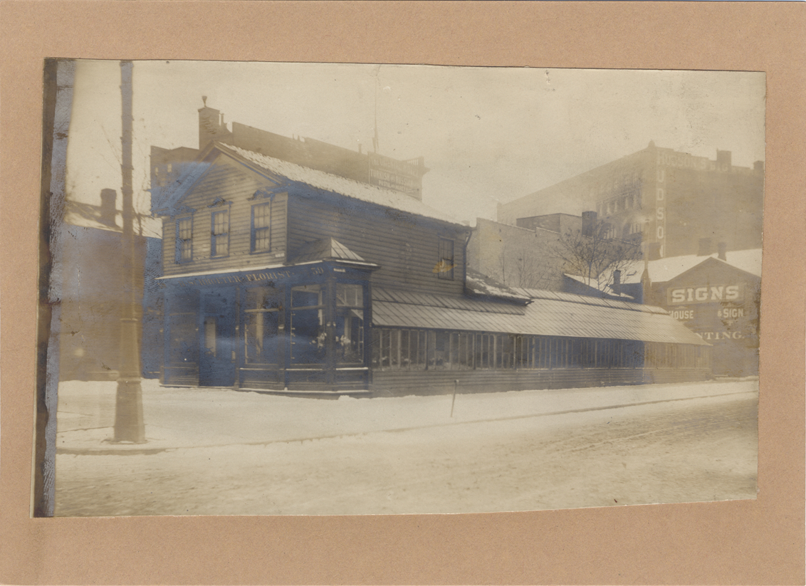 Clapboard house with long greenhouse, sign for "Schroeter Florist" on front, located at 59 Miami Avenue, other commercial buildings in background. Handwritten on back: "East of Miami & north of John R, in the rear the Plaza, Jan. 10, 1906."