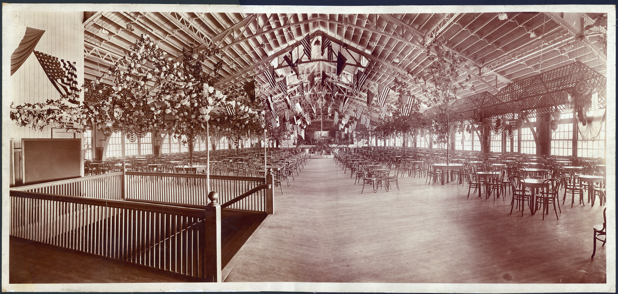 Wood-floored dining room, with windows lining both walls, bandstand at end. Wide stairway leaded up to the room. Flags hang from ceiling and draped in windows; canopy of roses over stairway. Round tables with bentwood chairs. Handwritten on photograph back: "Wayne Gardins, Third St. & Detroit River. 9991."