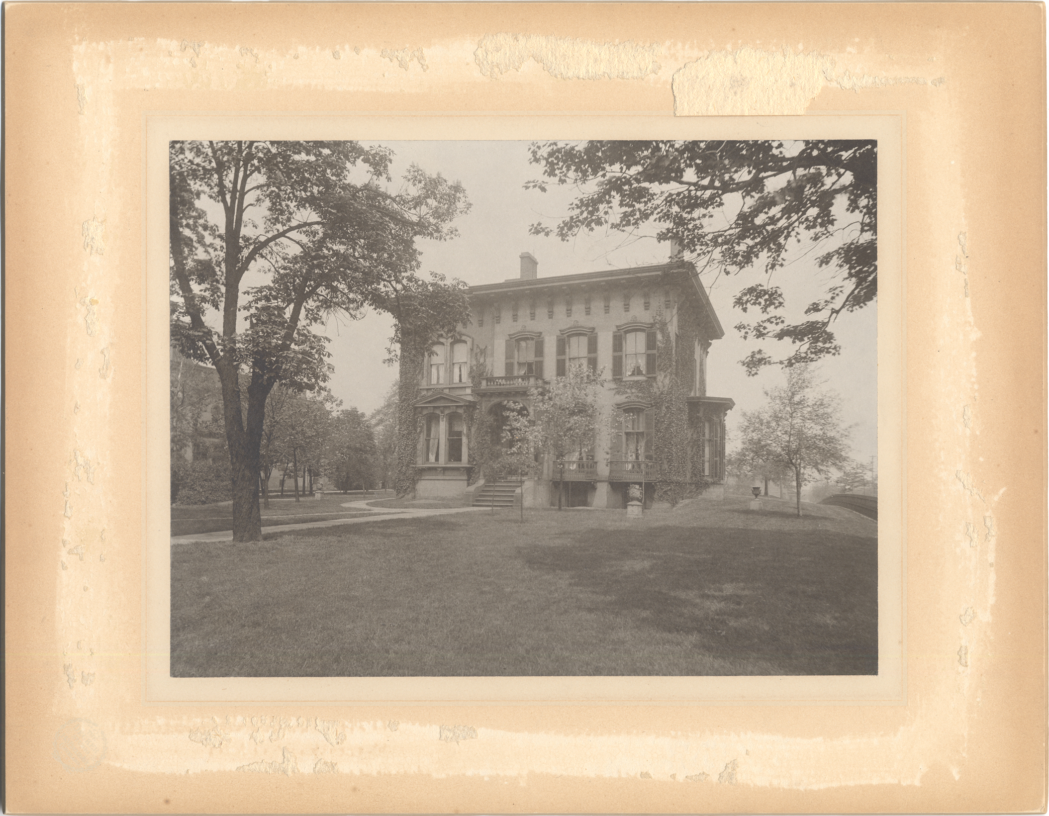 View of vine-covered house; Italianate architecture; urns on front lawn. Handwritten on back: "ca. 1880-88."