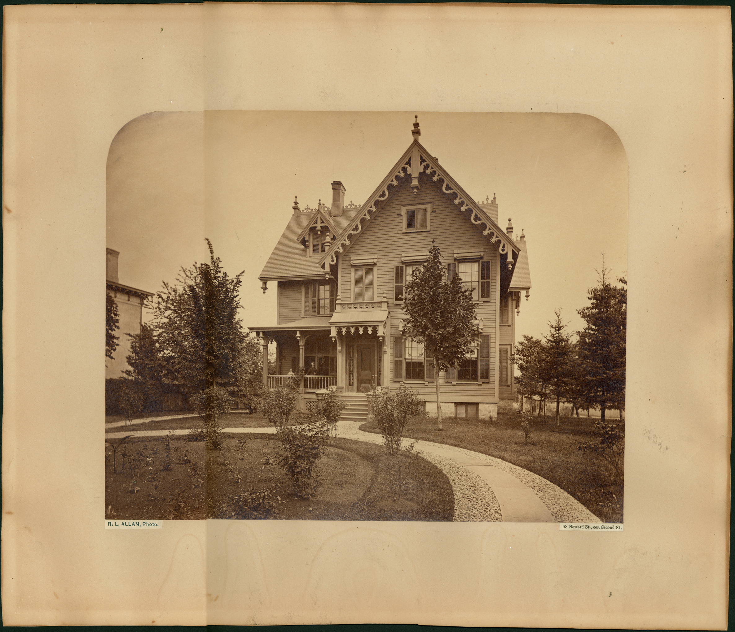 View of wooden-frame house with decorative gable trim; woman and girl stand on porch; circular drive in front. Label on front: "R.L. Allan, photo., 58 Howard St., cor. Second St." Handwritten on back: "750, 2250 E. Jefferson Ave."