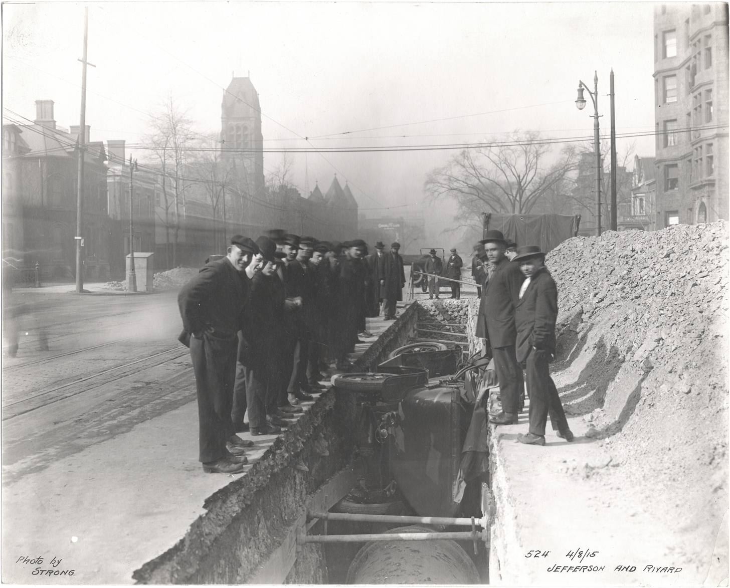 View of automobile laying on side in ditch at the side of the road; onlookers gather around ditch; pipe visible below car. Handwritten on photograph: "524-4/8/15, Jefferson and Rivard." Handwritten on back: "Breaks."