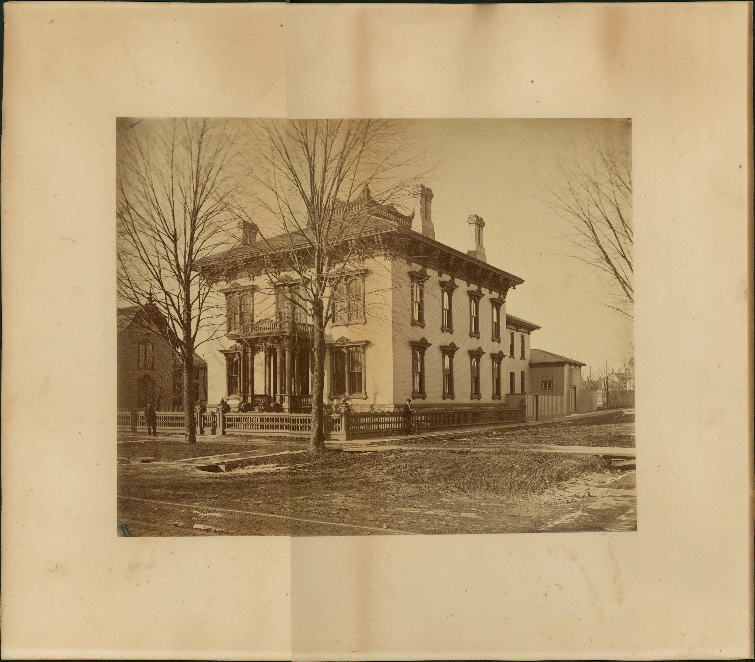 View of Italianate house; balustrade on roof; decorative brackets under eaves; window enframements; man with bicycle stands in front of fence surrounding house. Handwritten on back: "Northwest corner of Fort Street and Brooklyn, built 1868-69, occupied (to1825) by S.G. Caskey." Listed in 1882 City Directory as Samuel G. Caskey.