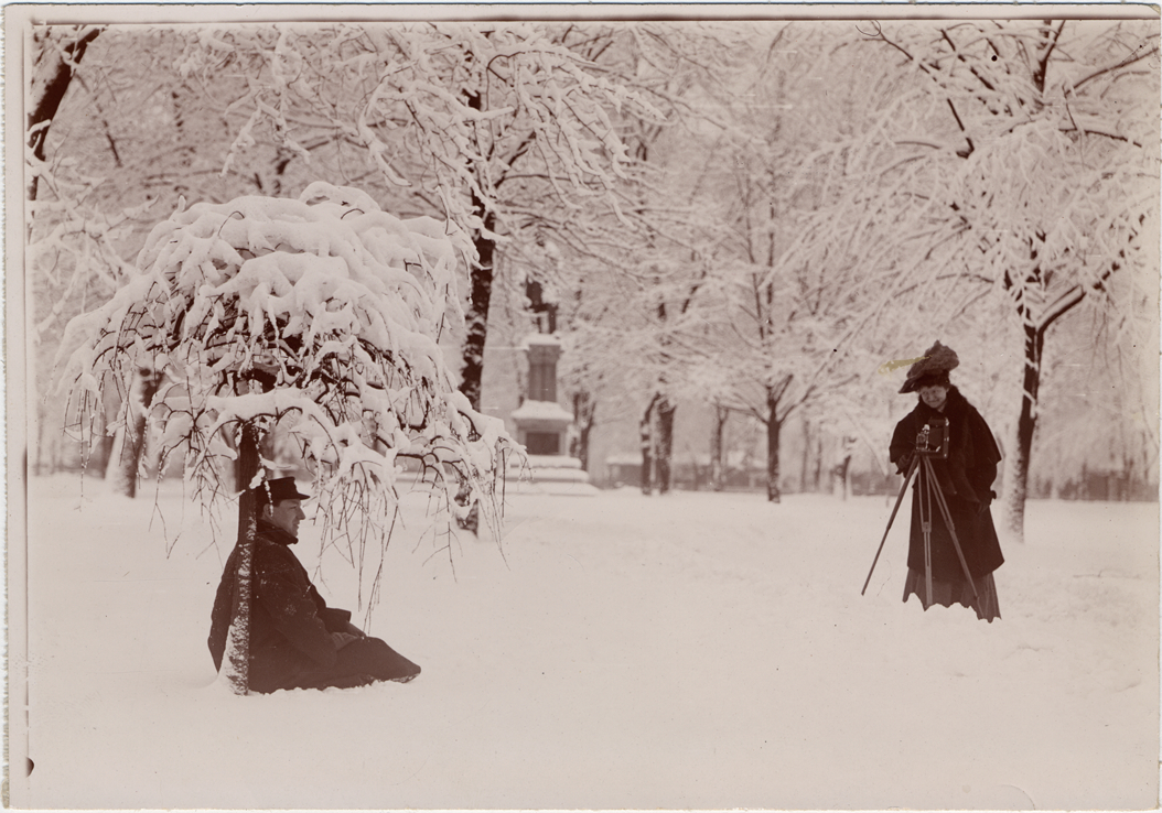 View of woman photographing man who is sitting under snow-covered tree in winter; camera on tripod.