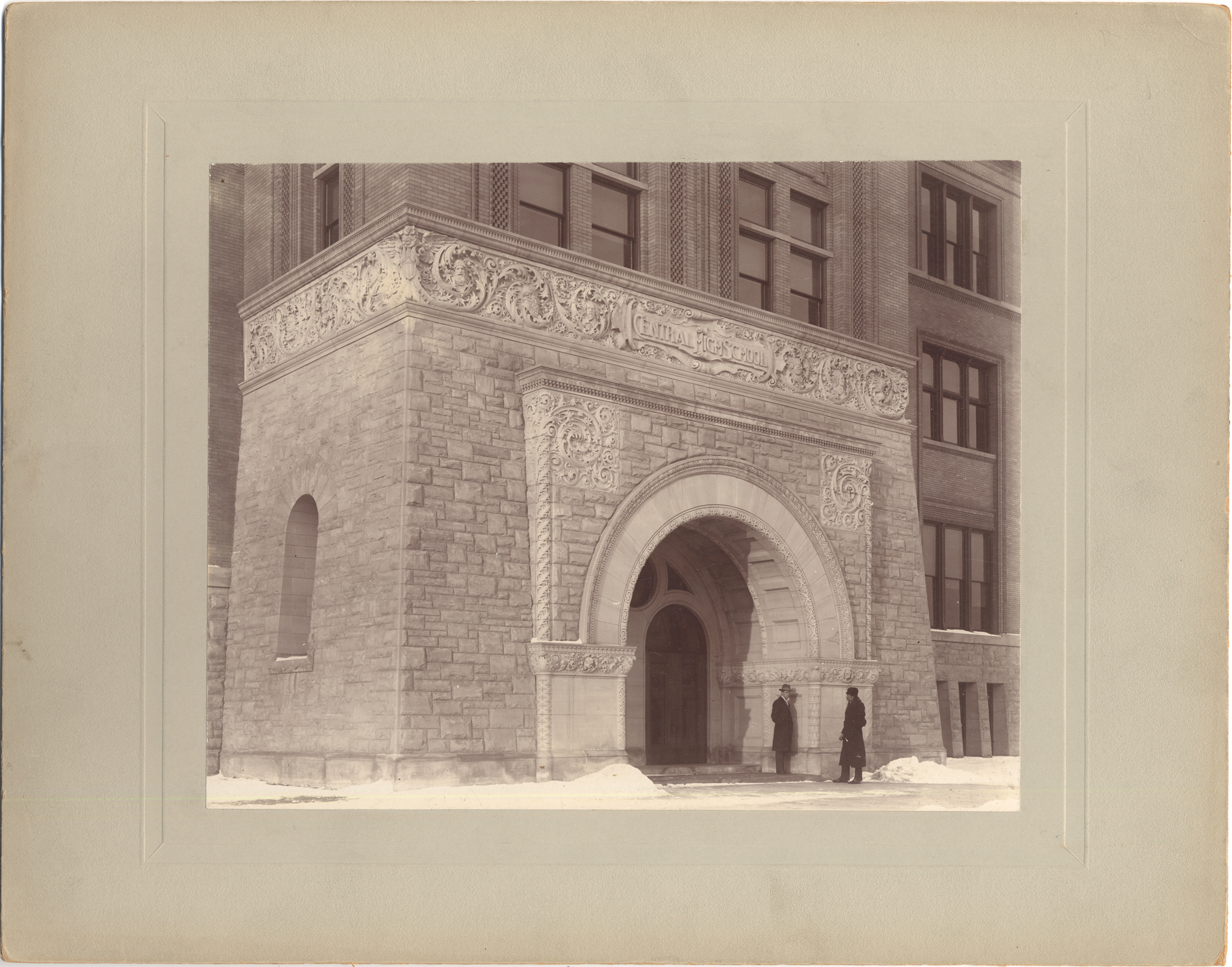 Arch over front entrance of school; decorative stonework; arch surround and wall plaques decorated with floral detail; two men stand at entrance; "Central High School" in stone over arch.