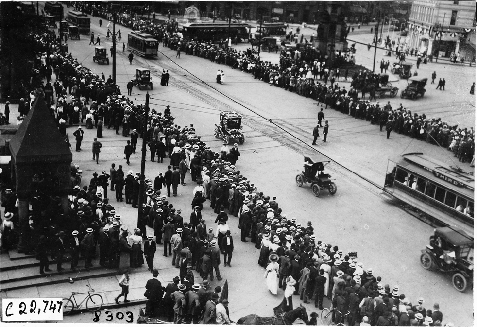 Automobile parade in Detroit before start of 1909 Glidden Tour, Detroit, Michigan