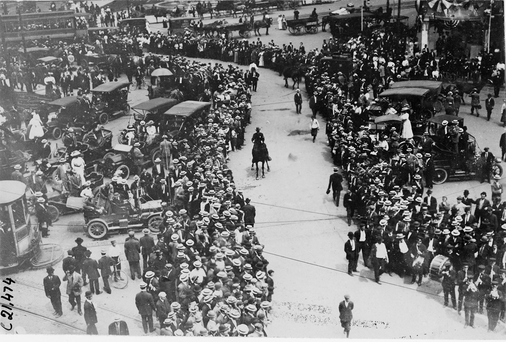General view of start of the 1909 Glidden Tour, Detroit, Michigan