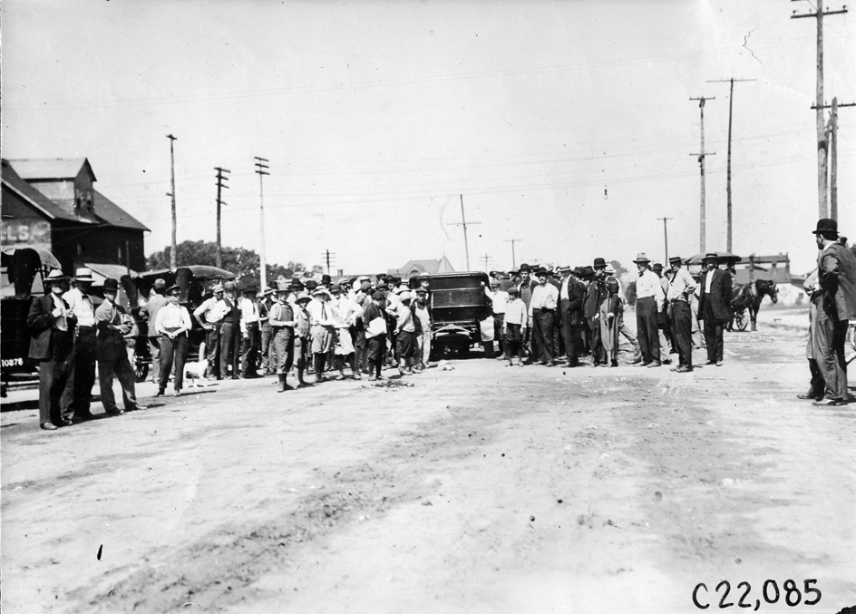 View of crowd surrounding an unidentified tourist vehicle taking in gasoline at Carroll, Iowa at the 1909 Glidden Tour. Stamped on back: "Photo by Spooner & Wells, Inc. 1931 Broadway, N.Y."