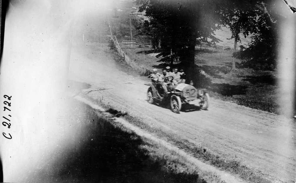 View of Gene Bemb and three passengers in Chalmers-Detroit car #52 on rural road, lake visible on right, near Mankato, Minnesota, at the 1909 Glidden Tour. Left side of photo is washed out. Stamped on back: "Spooner & Wells, Inc., photographers, telephones 3472-3473 Columbus, 1931 Broadway, New York."