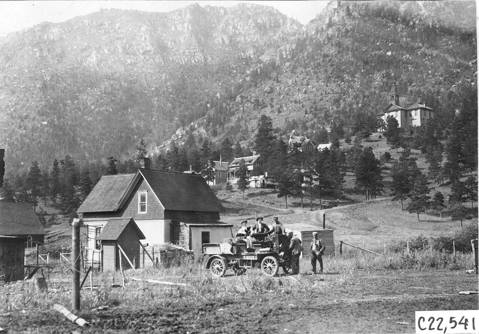 Houses and a church in the Colorado mountains, at 1909 Glidden Tour