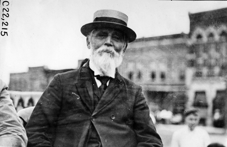View of Judge A.C. Cooper of Northfield, who convicted the Younger brothers after the great robbery of 1876, at the 1909 Glidden Tour. Photo edges cut unevenly. Stamped on back: "Spooner & Wells, Inc., photographers, telephones 3472-3473 Columbus, 1931 Broadway, New York."