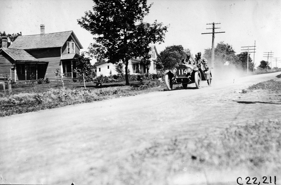 View of John C. Moore and two passengers in Lexington car #114 entering Mankato, Minnesota, houses on side of road, at the 1909 Glidden Tour. Photo edges cut unevenly.