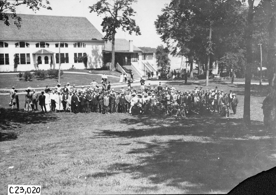 View of tourists having their picture taken in front of the Tonka Hotel in Minnesota, at the 1909 Glidden Tour. Lower right corner missing. Stamped on back: "Photo by N. Lazarnick, 29 West 42nd Street, N.Y., tel. 594 Bryant."