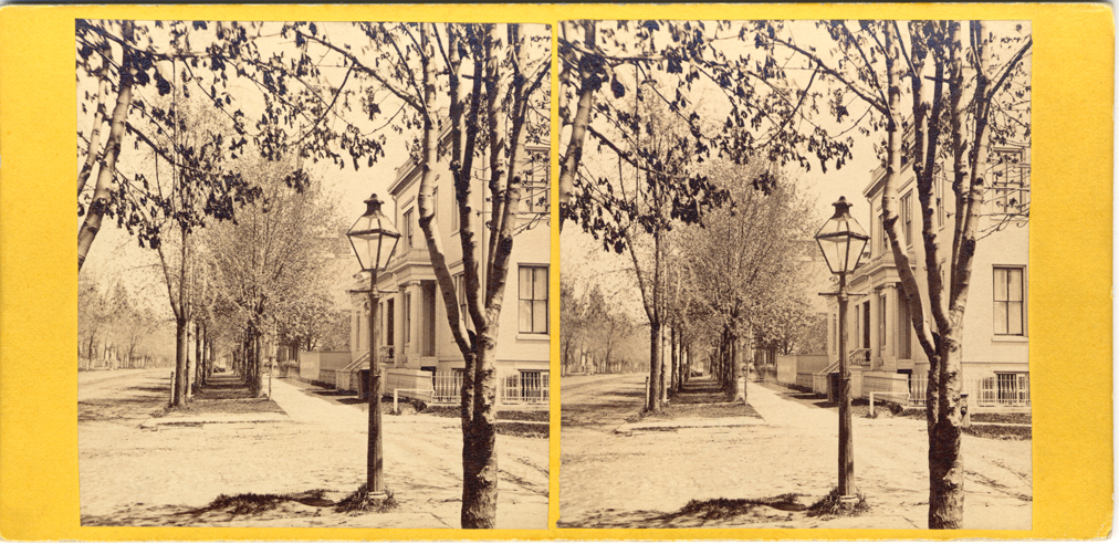 Goldenrod mount. View of a street lamp, houses and trees on Fort St. Printed on front of stereocard: "Photographic sketches in and about the city of Detroit consisting of street and marine views, public buildings, churches, monumental and other objects of interest, photographed and published by Jex Bardwell." Handwritten on back: "1871, looking east, corner of 1st St. & ... "
