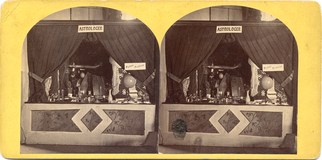 Gold mount. Dome topped. Exhibit booth representing Washington Irving's story, Legend of the Arabian astrologer, a curtained booth bearing signs, "Astrologer" and "future revealed", other articles in booth include, a globe, human skull, maps, and bottles. Printed on stereocard back: "Views of the booths as shown in the Author's Carnival, held in Detroit at Young Men's Hall, June 7th to 12th, 1875 for the benefit of the Young Men's Christian Association and Home of the Friendless, Astrologer, Irving, photographed and published by Jex Bardwell for the associations, copyright 1875, by Jex Bardwell."