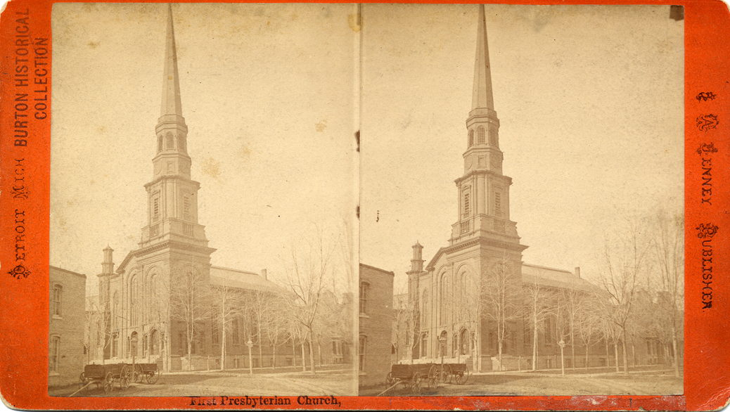 Orange mount. View of First Presbyterian Church. Printed on front of stereocard: "Detroit, Mich., J.A. Jenney, publisher, First Presbyterian Church." Handwritten on stereocard back: "1857, N.W. cor. of Gratiot & Farmer."