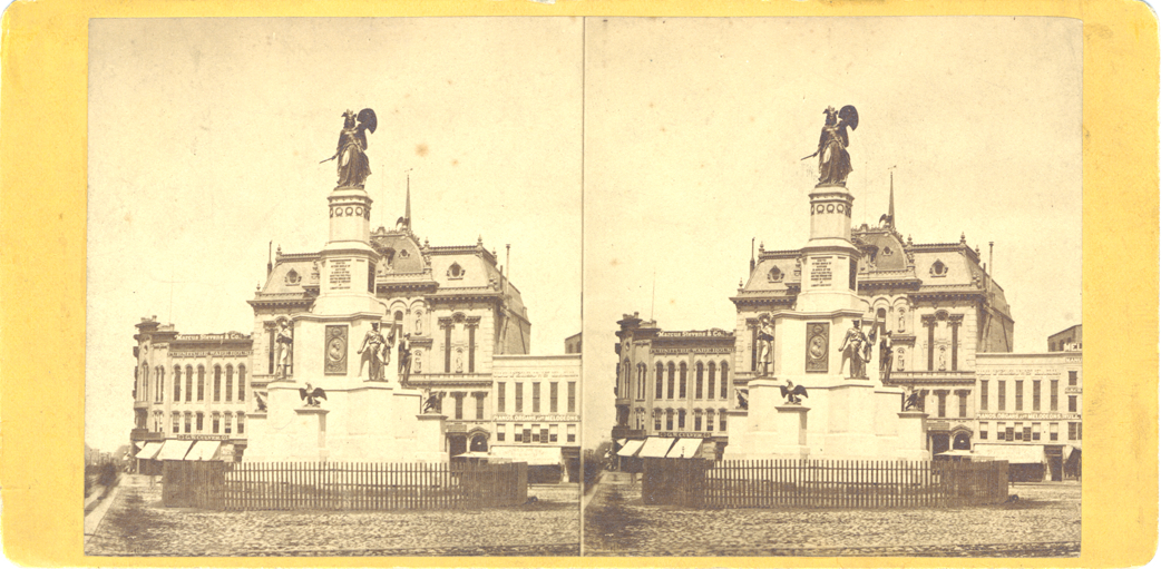 Gold mount. View of the front of the Soldiers' and Sailors' Monument. Printed on stereocard back: "Photographic sketches in and about the city of Detroit consisting of street and marine views, public buildings, churches, monumental and other objects of interest, photographed and published by Jex Bardwell."