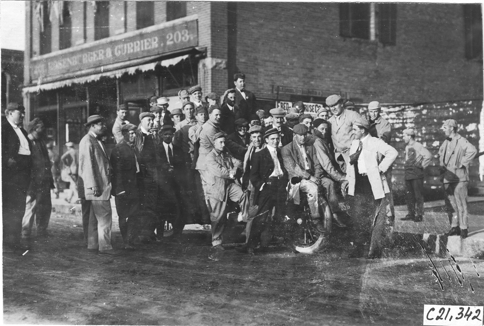 View of George Smithson in Studebaker #79 overflowing with other tourists, at the 1909 Glidden Tour. Photo edges cut unevenly. Stamped on back: "Photo by Spooner & Wells, Inc. 1931 Broadway, N.Y."